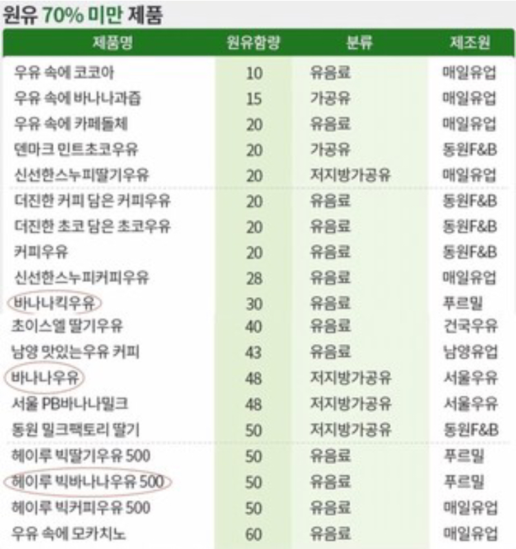 ⭕️바나나 우유의 원유 함유량은 85.7%로 단연 1위였습니다‼️